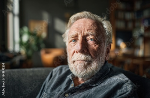 Close-up portrait of an elderly man with a thoughtful expression, gray hair and beard