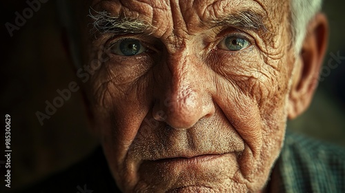 Close-up portrait of an elderly man with wrinkles, looking at the camera with a serious expression.