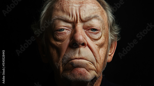 senior, man, face, portrait, serious, expression, wrinkled, aged, concerned, gloomy, sad, intense, frown, eye, nose, mouth, black, background, close, up, sharpened, light, shadow, detail, thoughtful, pensive, stern, unhappy, melancholy, dignified, elderly, emotion, human, image, photo, studio, depth, contrast, texture, skin, hair, dignity, wisdom, grief, contemplation, anxiety, discontent, forehead