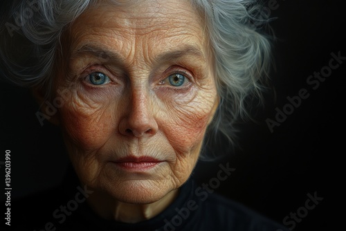 Closeup portrait of an unhappy elderly woman with wrinkles and expressions of wisdom in a neo-realism style on a blue background