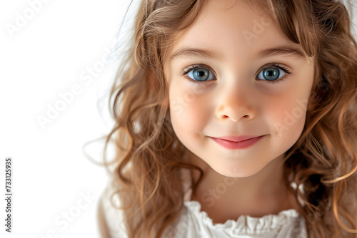 Closeup portrait of beautiful blond hair and blue eyes little girl isolated on white background