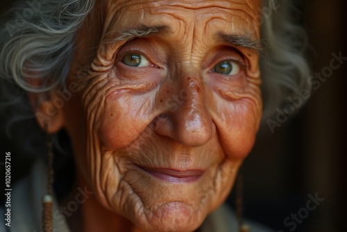 Close-up portrait of elderly woman with expressive wrinkles and warm smile