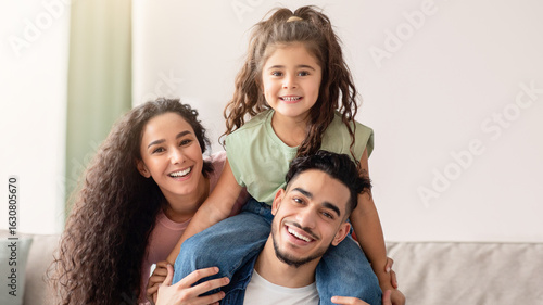 Closeup Portrait Of Happy Middle Eastern Parents And Their Cute Little Daughter Bonding Together At Home, Cheerful Arab Mom, Dad And Child Having Fun In Living Room, Laughing And Looking At Camera