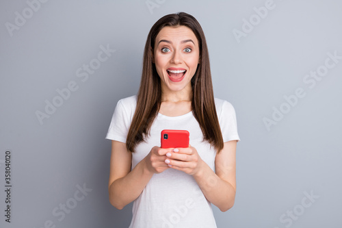 Close-up portrait of her she nice attractive lovely pretty charming cute overjoyed cheerful cheery girl using digital device having fun good news isolated over grey pastel color background