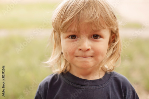 close-up portrait of the pensive face of a little blond boy on a green background summer street