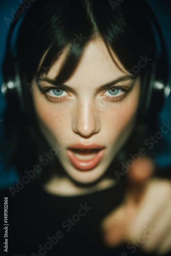 Close-up portrait of woman, intense expression on her face, one hand on headphones, the other pointing toward the camera. Side lighting with shallow depth of field.