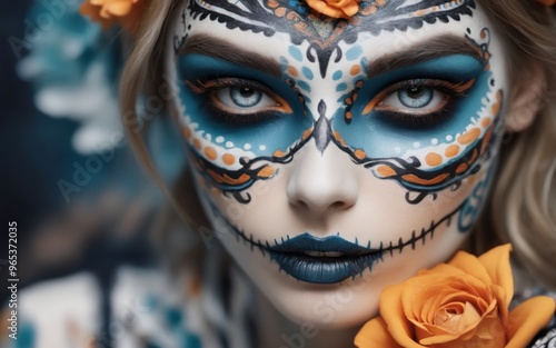 skull, woman, closeup, portrait, painted, design, pattern, black, white, blue, swirl, intricate, eye, wave, outfit, floral, background, blurred