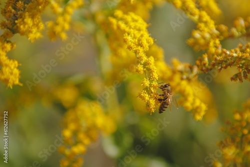 Close-up shot of a bee drinking nectar from a Solidago virgaurea