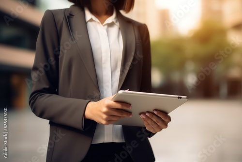 Close-up shot of a confident businesswoman delivering a compelling corporate presentation using a tablet. The focus is on her hands and the tablet screen. Non-existent person. Generative Ai