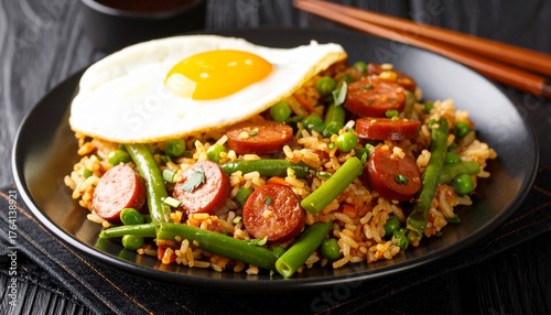 closeup Shot Of A Fried Rice With Green Bean And Chinese Sausages Served With Fried Egg