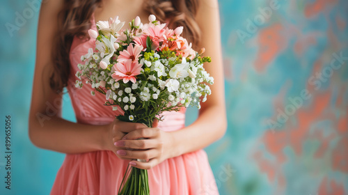 Close-up shot of a girl in a pastel pink dress holding a bouquet of colorful flowers in her hands