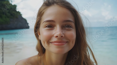 closeup shot of a good looking female tourist. Enjoy free time outdoors near the sea on the beach. Looking at the camera while relaxing on a clear day Poses for travel selfies smiling happy tropical