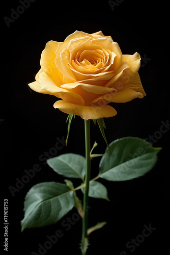 Close-up shot of a rose, light and shadow make The details of the petals and leaves are clearly shown. The composition of images on a black background makes this rose look outstanding and beautiful.