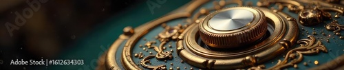 Close-up shot of a sleek, metallic push-button control embedded within ornate, gilded detailing; a luxurious blend of modern technology and classical finery , art nouveau, vintage, button