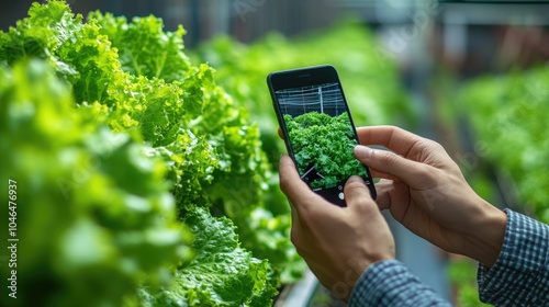 smartphone, capturing, crisp, shot, row, fresh, greener, sunlit, agricultural, greenhouse, food, people, up, phone, hand, control, phone, digital, system, screen, field, environment, grow, nature, farmer, vegetable, rural, communication, leaf, healthy, business, industry, photo, technology, tree, sunlight, cultivation, concept, growth, lettuce, salad, plant, gardening, sustainable, water, fertilizer, holding, mobile