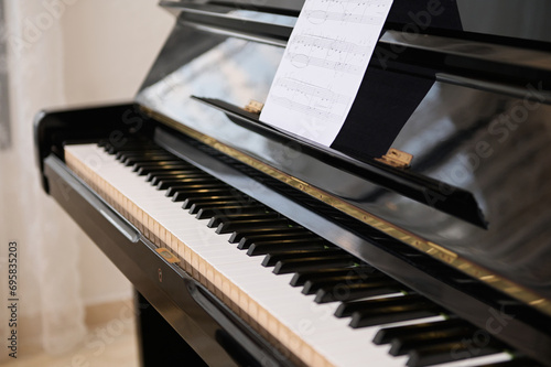 Close-up shot of old piano with open keyboard and paper sheet with notes