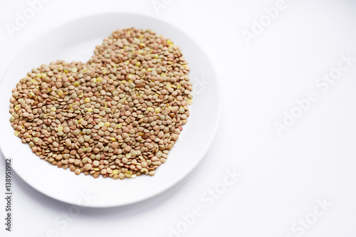 Closeup shot of ripe lentil seeds laid out in shape of heart on white porcelain plate