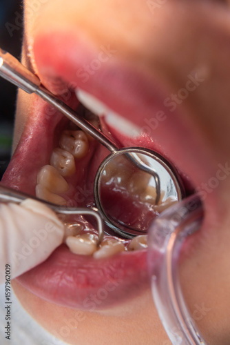 lower, scaling, dental, plaque, calculus, mirror, teeth, hygiene, tartar, oral, teeth, front, scraper, buildup, removal, care, scaler, cleaning, prophylaxis, instrument, gum, inspection, dentist, clinical, dental care, gloved, hand, closeup, lower jaw, open mouth, health, suction, check-up, treatment, precise, anterior, mouth