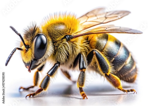 bee, honey bee, insect, macro, photo, white background, studio shot, closeup, detailed, hi-res, image, nature, wildlife, animal, pollinator, wing, leg, antennae, fuzzy, body, texture, colours, light, bright, background, isolated, natural, realistic, honey, pollen, apiculture, apiculture, invertebrate, arthropod, flora, fauna, beautiful, stunning, amazing, exquisite, honed, professional, quality, photo