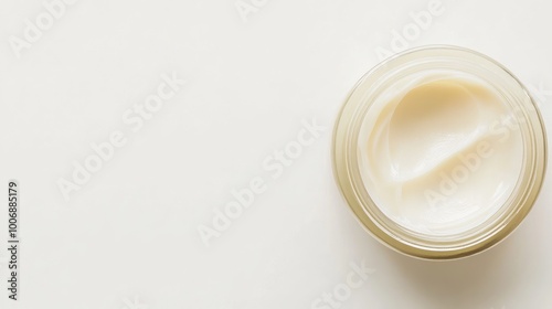 Close-up top view of a moisturizer sample in a jar. Shiny, smooth cream texture without any branding or logo. Clean, simple white background.