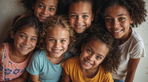 Close-up top view of a varied group of happy and cheerful children of different nationalities. Showing union. Inclusion. And connection as they meet and relate. eye contact.