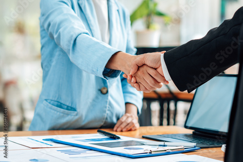 Close-up two business men holding hands, Two businessmen are agreeing on business together and shaking hands after a successful negotiation. Handshaking is a Western greeting or congratulation.