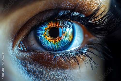 eye, iris, pupil, lash, closeup, macro, detail, vibrant, colours, blue, orange, yellow, gaze, look, vision, sight, beauty, human, anatomy, photo, image, picture, photo, art, artistic, stunning, impressive, captivating, mesmerizing, intense, sharp, sharpened, detailed, intricate, texture, light, shadow, contrast, depth, field