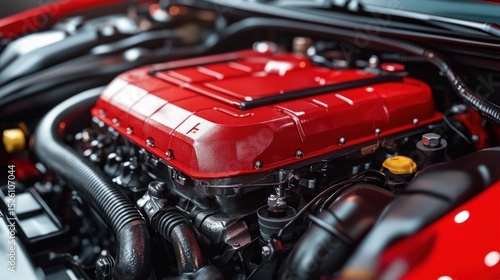 Close-up view of a clean, modern car engine with a prominent red engine cover and various black hoses and metal components under the hood