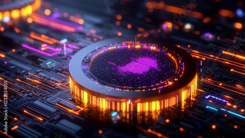Close-up view of a futuristic circuit board with glowing neon patterns, featuring vibrant purple and orange lights emanating from a central