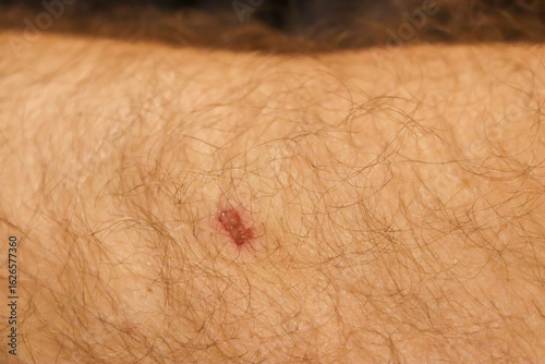 Close-up view of a minor skin injury on a hairy arm, showcasing a small cut that appears fresh. Ideal for medical discussions or health-related content.