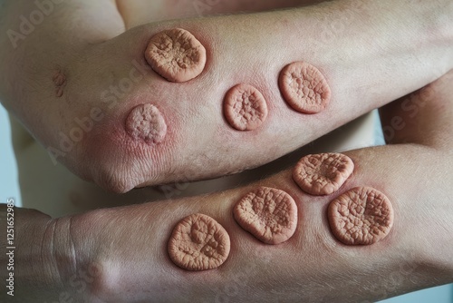 Close-up view of a person's arms with multiple circular skin lesions, possibly keloids or similar skin conditions. Medical image showcasing unique skin texture and irregularities.
