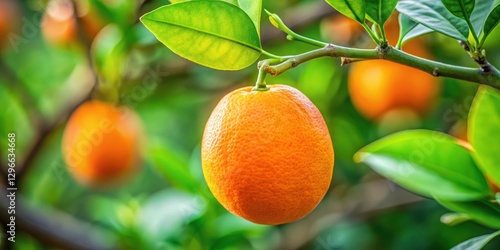 Close-up view of a single orange fruit branch on a tree with leaves and small branches, tree detail, tree, tree detail