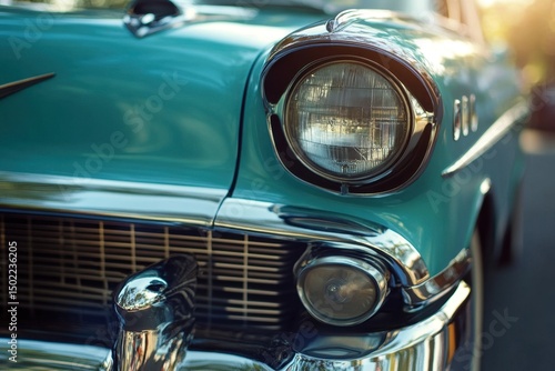Close-up view of a vintage car showcasing a gleaming chrome headlight. The vibrant teal color and detailed elements highlight the beauty of classic automotive design.