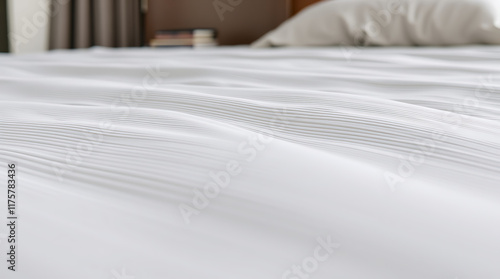 Close-up view of a white bedsheet with soft, undulating wrinkles, showcasing a smooth texture. The background is blurred, showing a portion of a bed and a dark-colored nightstand.