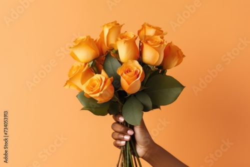 Closeup view of an African American woman's hand presenting a vibrant bouquet of roses, warm tones of the flowers against the orange backdrop