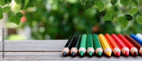 Close-up view of colorful pencils lined up on a rustic table surrounded by greenery, showcasing vibrant hues perfect for creative projects