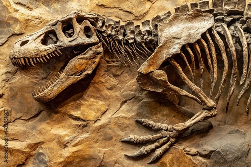 Closeup view of dinosaur fossil embedded in sedimentary rock layers showcasing ancient life, Closeup of dinosaur fossil within sedimentary rocks