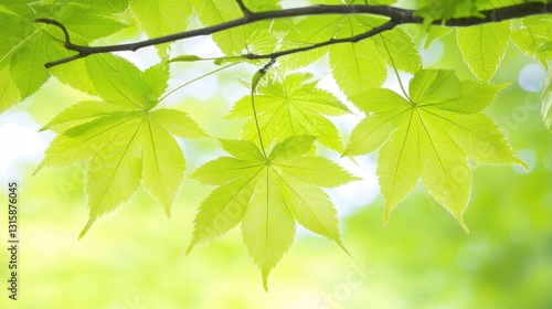 Close-Up View of Fresh Green Maple Leaves Glimmering with Water Drops Against a Soft Background in Nature