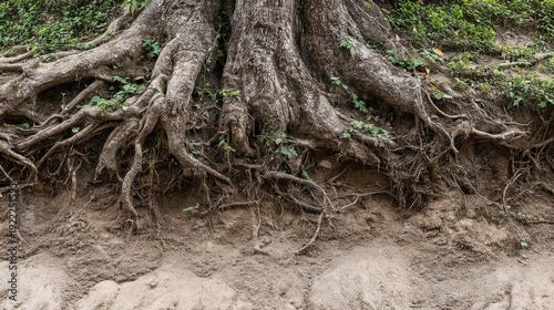 Close-up View of Gnarled Tree Roots Exposed in Soil With Green Plants Nearby Showing Details of Natures Strength and Growth