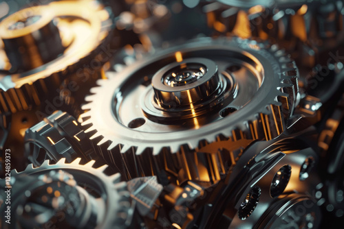 Close-up view of interlocking metal gears in black and white. Suitable for illustrating mechanical engineering, industrial design, and machinery concepts.