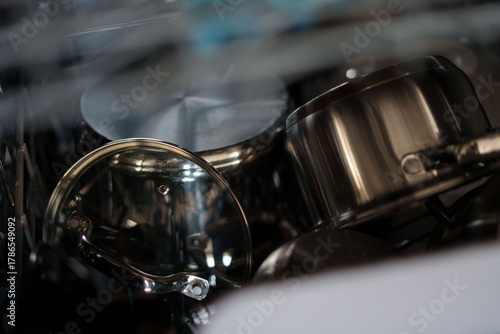 close-up view of neatly arranged stainless steel cookware, featuring pots and pans with shiny metallic surfaces inside a modern kitchen dishwasher, captured in soft lighting, angle, shine
