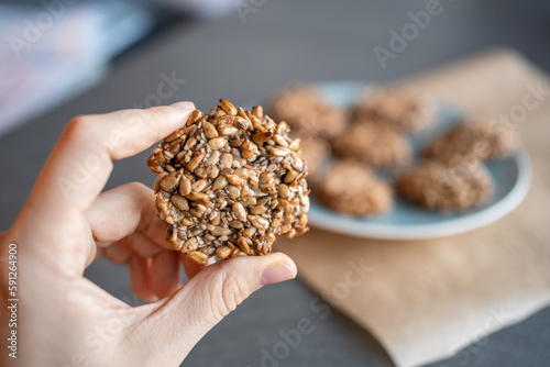 Close-up view of piece of cookies with banana and seeds in a woman's hand