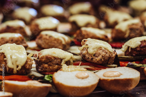 Closeup View of Sliced Bread Spread on the Table with Ingredients on them for Small Burgers - Kitchen Set, Concept of the Holiday Evening Dinner Table