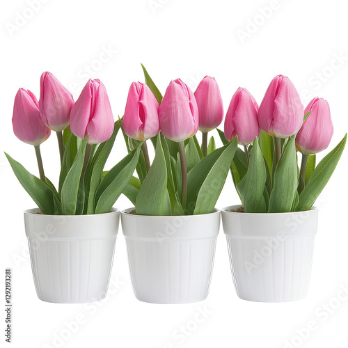 Closeup view of vibrant pink tulips in white pots arranged for a cheerful spring display, Closeup view pink tulips arranged in white pots isolated on Transparent background