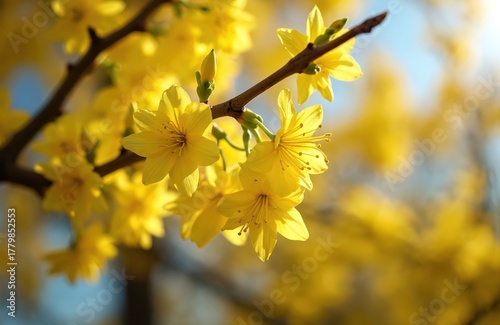 Close-up view of vibrant yellow blossoms on a tree branch in springtime garden. Delicate flowers bloom against a bright blue sky. This image represents renewal and the beauty of natures season.