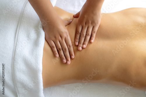 Closeup woman customer enjoying relaxing anti-stress spa massage and pampering with beauty skin recreation leisure in day light ambient salon spa at luxury resort or hotel. Quiescent