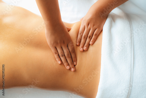 Closeup woman customer enjoying relaxing anti-stress spa massage and pampering with beauty skin recreation leisure in day light ambient salon spa at luxury resort or hotel. Quiescent