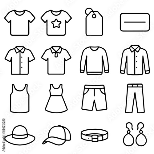 Clothing Collection Icons: A minimalist and stylish illustration of clothing collection. Each icon embodies the essence of casual clothing and fashion