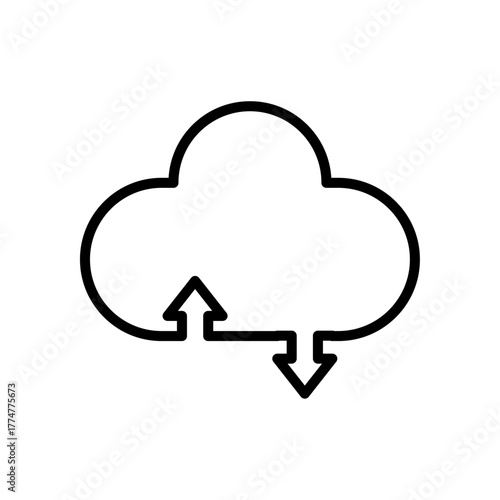 Cloud computing icon showing upload and download arrows. Vector symbol for data storage, synchronization, file transfer, online backup, digital network, and technology concept.
