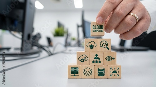 cloud computing, technology, business, networking, digital transformation, storage, data management strategy using wooden blocks with icons in office environment for IT solutions.
